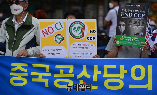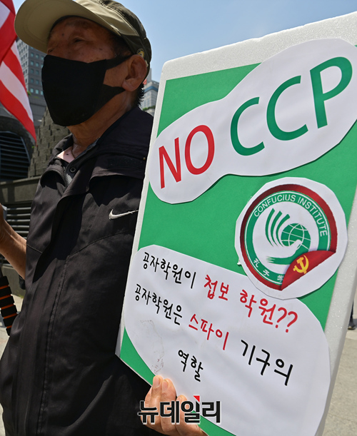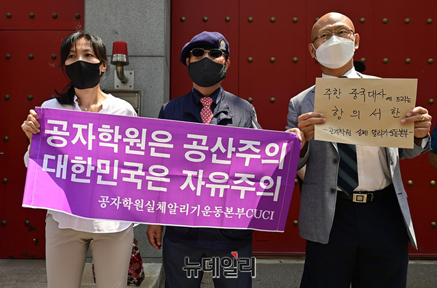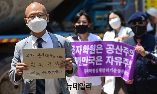 한민호 공자학원실체알리기운동본부(이하 공실본) 대표가 2일 오전 서울 중구 주한중국대사관 앞에서 공자학원 추방을 촉구하는 기자회견 직후 항의서한을 전달하고 있다.공실본은 이날 기자회견에서 "공자학원은 중국공산당이 통일전선공작을 펼치는 거점이며 '공자'라는 가면을 쓰고 '중국어와 중국문화'를 내걸고 젊은이들을 공산주의로 물들이는 세뇌공장소다"며 즉각 철수할 것을 요구했다. 이어 "공자학원을 유치한 22개 대학은 공자학원의 전모를 조사하고 대책을 수립하라"고 했다.공자학원은 중국 교육부가 세계 각국의 고등교육기관과 연계해 중국어와 중국문화를 세계에 전파하기 위해 세운 비영리 교육기관이다.지난해 4월 기준으로 162개 국가에 545개 공자학원과 1,170개 공자학당이 설치돼 운영 중이다. 우리나라에서는 전 세계에서 세 번째, 아시아에서는 가장 많은 23개의 공자학원이 서울부터 제주까지 전국에 걸쳐 운영되고 있다.