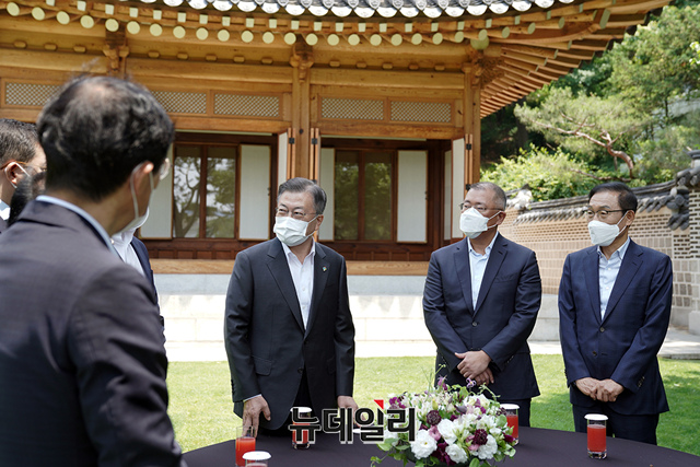 문재인 대통령이 2일 오후 서울 종로구 청와대 상춘재에서 4대 그룹 대표와 간담회를 갖고 있다.
