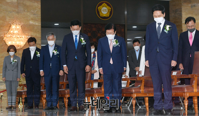 [포토] 국민의례하는 박병석 국회의장과 여야 대표