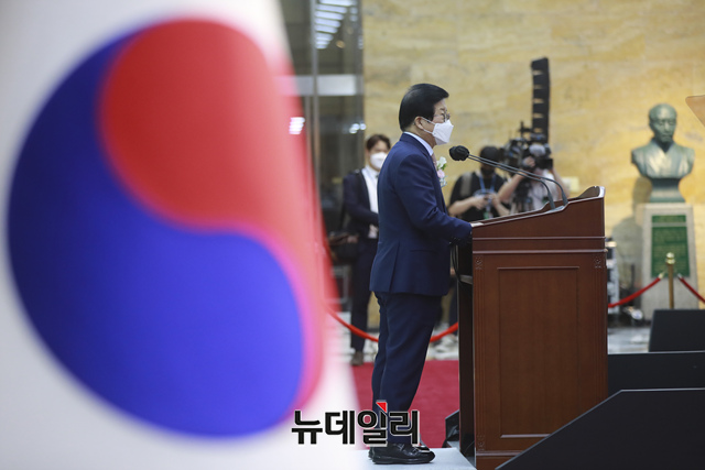 박병석 국회의장이 4일 오전 국회 중앙홀에서 열린 제73주년 국회 개원기념식에서 기념사하고 있다. (사진=공동취재단)