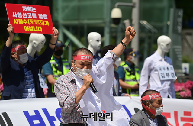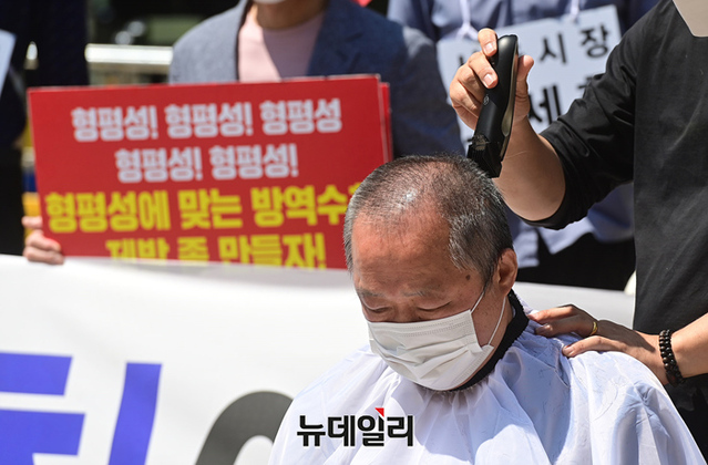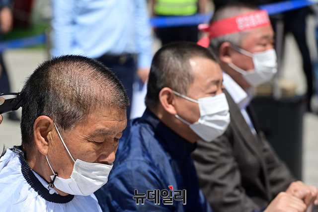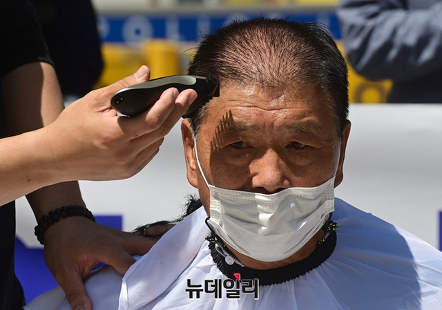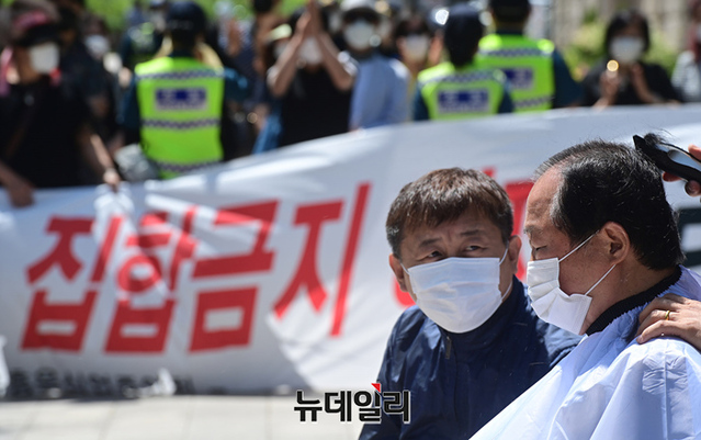 유흥음식업중앙회, 한국단란주점업중앙회, 콜라텍협회 등 집합금지 업종 회원들이 4일 오후 서울 중구 서울시청 앞에서 열린 집합금지 해제 촉구 기자회견에서 삭발식을 갖고 있다.이날 기자회견은 호소문 발표, 삭발식과 함께 김부겸 국무총리, 홍남기 경제부총리, 오세훈 서울시장의 이름을 단 마네킹을 세우고 계란과 밀가루를 던지는 퍼포먼스로 진행됐다. 일부 회원들은 밀가루와 계란 세례를 받은 마네킹을 부수며 집합금지 해제를 촉구했다.기자회견이 진행되는 동안 대표단 4명은 오 시장과 면담을 가졌다.