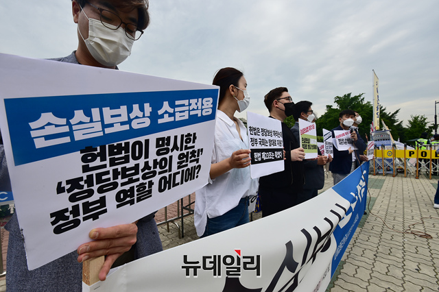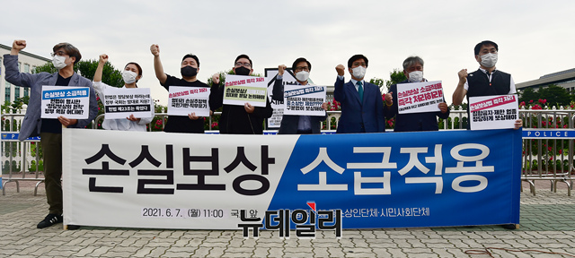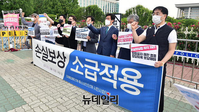 손실보상법 입법 촉구 피해업종·중소상공인·시민사회단체 관계자들이 7일 오전 국회 앞에서 손실보상 소급적용을 촉구 기자회견을 갖고 있다.