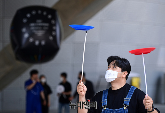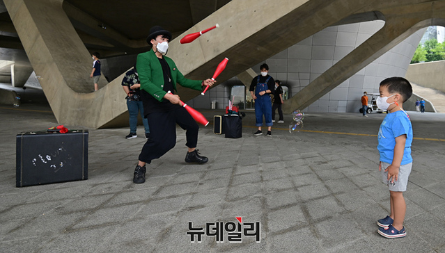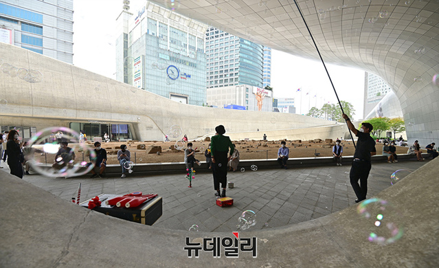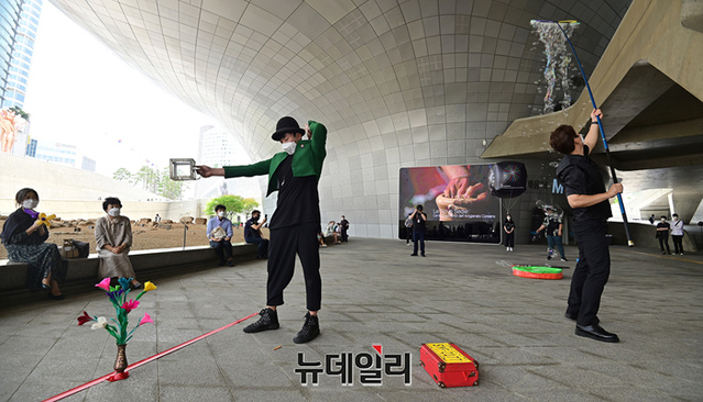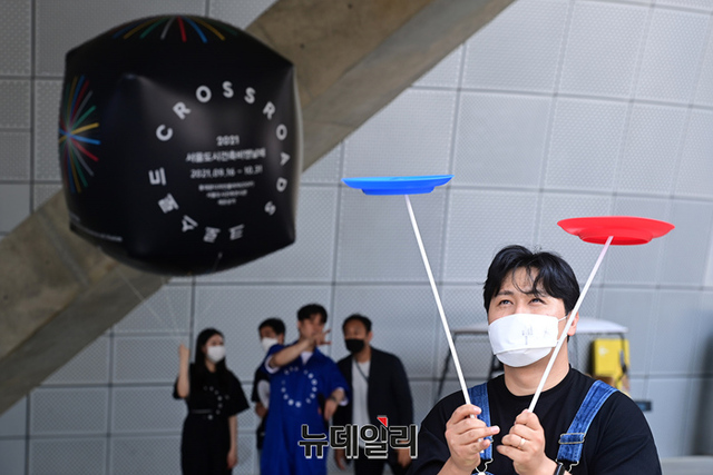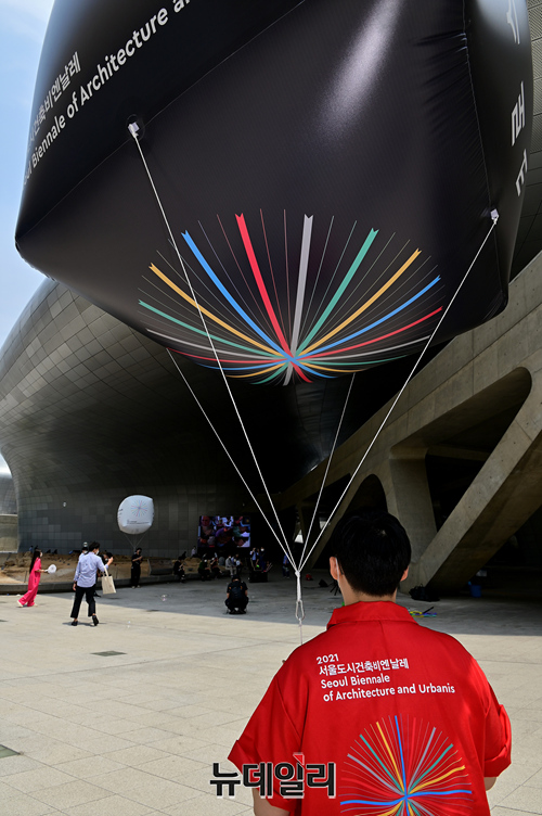 2021 서울도시건축비엔날레를 100일 앞둔 8일 오후 서울 중구 동대문디자인플라자(DDP)에서 비엔날레를 알리는 버블·마임 공연이 진행되고 있다.서울시는 비엔나레의 성공적 개최를 위한 D-100일 기념식을 이날 오후 5시 서울도시건축전시관에서 개최한다. 기념식에는 오세훈 서울시장이 프랑스, 네덜란드, 스위스, 이탈리아, 호주, 영국 등 6개국과 건축 분야 문화교류 증진을 위한 협력의향서를 각국 대사와 체결한다.올해는 '크로스로드, 어떤 도시에서 살 것인가'를 주제로 9월 16일부터 10월 31일까지 총 46일간 진행된다.