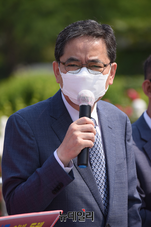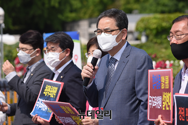 곽상도 국민의힘 의원(오른쪽 세 번째)이 8일 오전 서울 여의도 국회 앞에서 진행된 국가교육위원회 강행 민주당 규탄 기자회견에서 발언을 하고 있다.