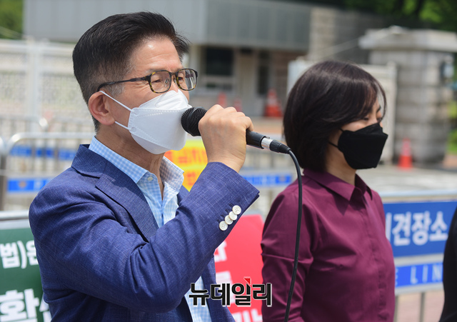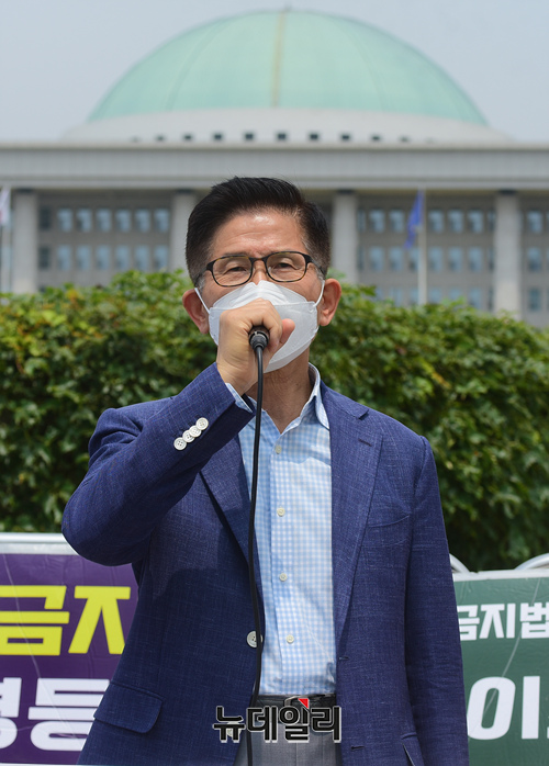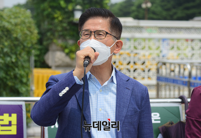 김문수 전 경기도지사가 8일 오전 국회 정문 앞에서 열린 북한인권을 위한 화요집회에 참석해 "북한인권재단 출범방해는 반인권적 헌법위반!"이라며 발언 하고 있다.