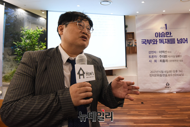 이택선 충남대학교 외교학 박사가 8일 오후 서울 여의도 정치문화플랫폼 하우스에서 하태경 국민의힘 의원과 조정훈 시대전환 의원이 공동으로 주최한 '2022 대선 특별기획 기적의 나라 대한민국, 7인의 대통령' 강연회에서 '이승만, 국부와 독재를 넘어'를 주제로 발표하고 있다.