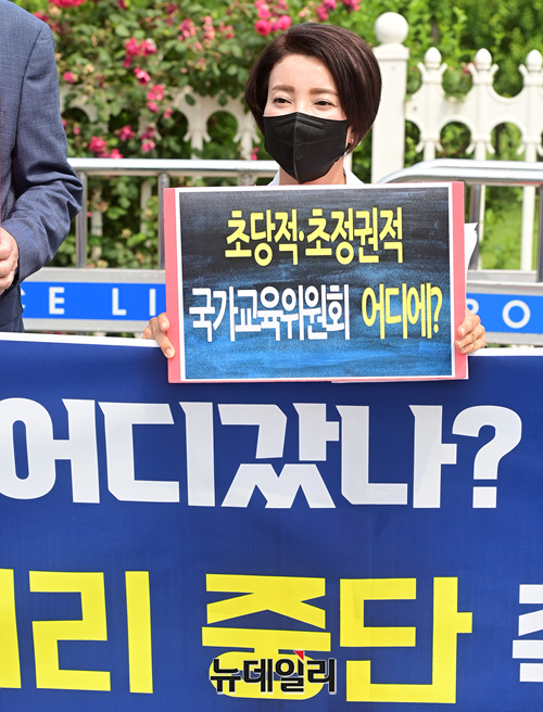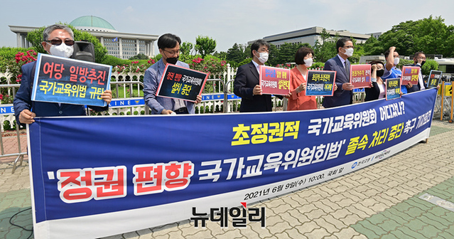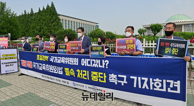 한국교총과 국민희망교육연대가 9일 오전 국회 정문 앞에서 국가교육위원회법 처리 중단을 촉구 기자회견을 갖고 있다. 기자회견에는 국민의힘 곽상도, 정경희, 배준영 의원이 참석했다.