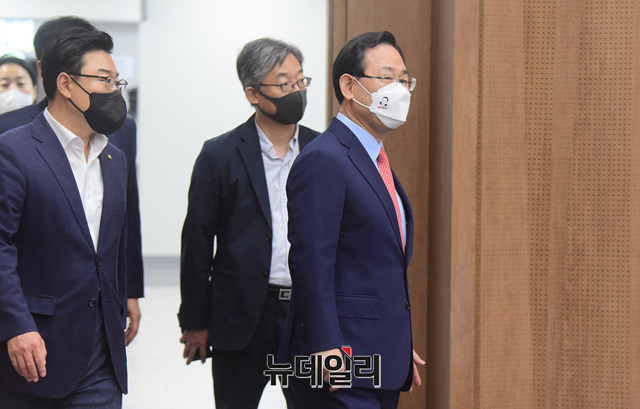 국민의힘 당 대표 선거에 출마한 주호영 후보가 9일 오전 국회 소통관에서 긴급 기자회견을 갖기 위해 입장하고 있다.