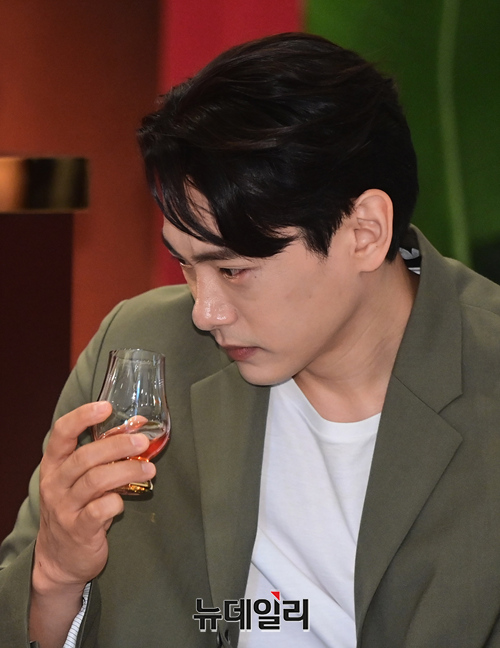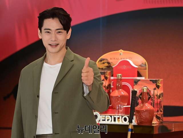 배우 유태오가 9일 오전 서울 여의도 페어몬트 앰버서더 서울에서 로얄살루트가 새롭게 출시한 '로얄살루트 21년 에스텐시아 폴로 에디션'을 소개하고 있다.