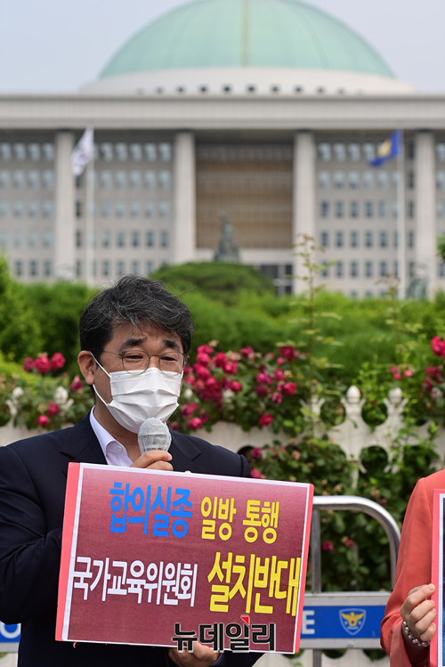 배준영 국민의힘 의원이 9일 오전 국회 정문 앞에서 한국교총, 국민희망교육연대가 주최한 국가교육위원회법 처리 중단 촉구 기자회견에 참석해 발언하고 있다. 기자회견에는 곽상도 의원, 정경희, 배준영 의원이 참석했다.