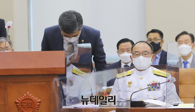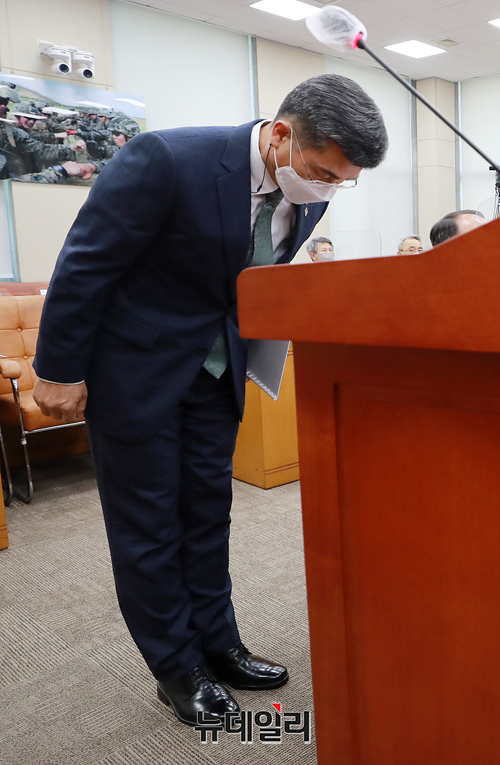 서욱 국방부 장관이 9일 오전 국회에서 열린 국방위원회 전체회의에 출석해 공군 성폭력 관련 현안보고를 마치고 인사하고 있다. (사진=공동취재단)