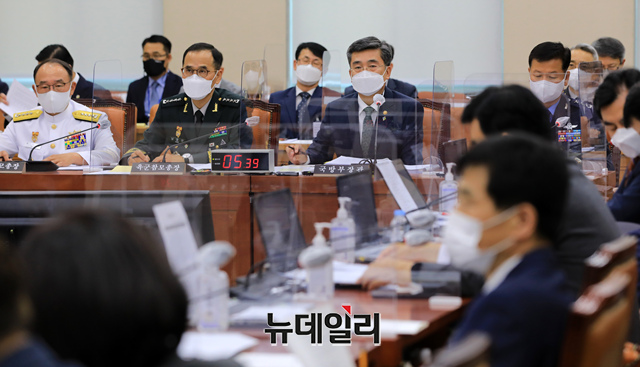 서욱 국방부 장관이 9일 오전 국회에서 열린 국방위원회 전체회의에 출석해 공군 성폭력 관련 긴급 현안보고를 앞두고 정상화 공군참모차장과 대화하고 있다. (사진=공동취재단)