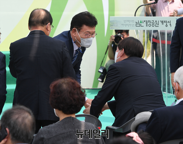 윤석열 전 검찰총장(왼쪽)이 9일 오후 서울 중구 남산예장공원 및 이회영 기념관 개장식에서 오세훈 서울시장과 인사를 나누고 있다.