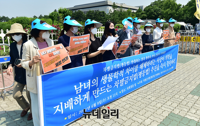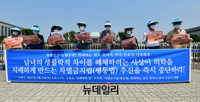 차별금지법 반대하는 전국 한의사·약사·간호사 연합 회원들이 9일 오전 국회 정문 앞에서 '남녀의 생물하적 차이를 해체하려는 사상이 의학을 지배하게 만드는 차별금지법 추진을 즉시 중단하라!'며 기자회견을 갖고 있다.