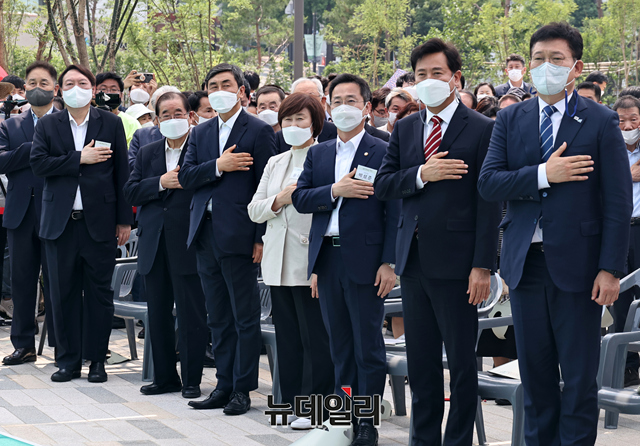 윤석열 전 검찰총장이 9일 오후 서울 중구 남산예장공원에서 진행된 개장식에서 국민의례를 하고 있다.