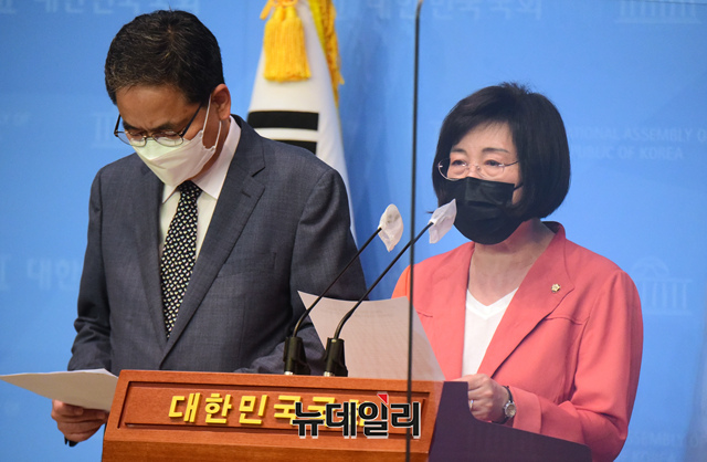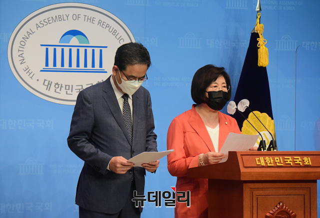 국회 교육위원회 소속 곽상도, 정경희 국민의힘 의원이 9일 오후 국회 소통관에서 기자회견을 갖고 국가교육위원회법 제정을 반대하고 있다.