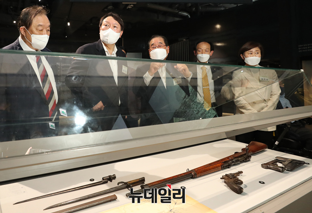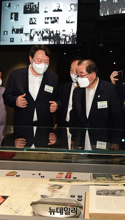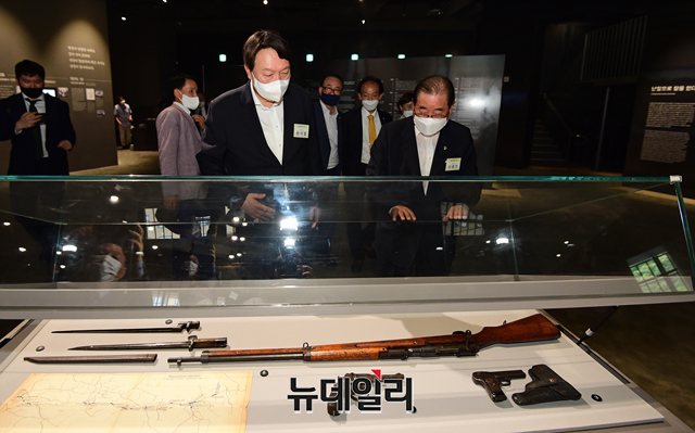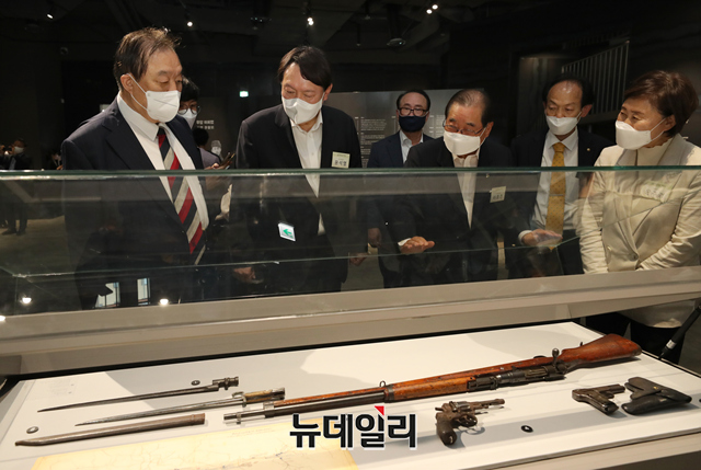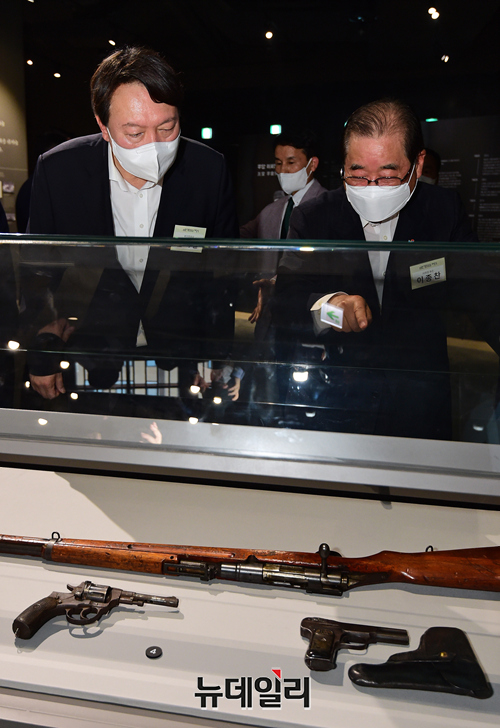 윤석열 전 검찰총장이 9일 오후 서울 중구 남산예장공원에 개관한 우당 이회영 기념관 에서 이회영의 후손인 이종찬 대한민국임시정부기념관 건립위원장의 안내로 봉오동·청산리전투때 사용된 옛 체코군단의 소총을 살펴보고 있다.