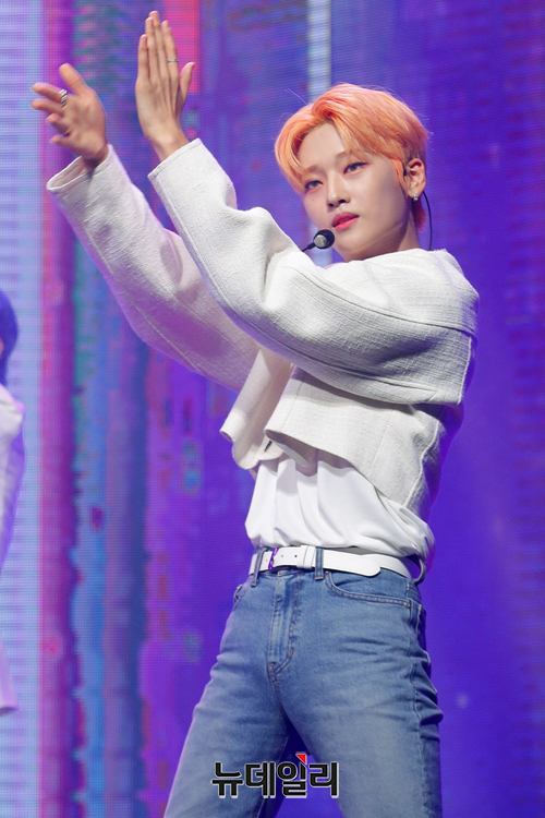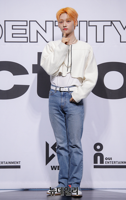 아이돌그룹 '위아이(WEi)' 멤버 강석화가 9일 오후 온라인으로 열린 세 번째 미니앨범 'IDENTITY : Action' 발매 기념 쇼케이스에서 포즈를 취하고 있다.