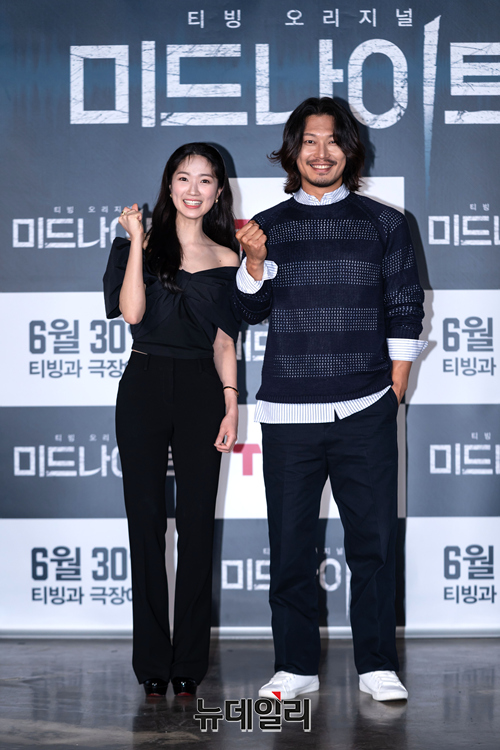 배우 김혜윤(왼쪽)과 배우 박훈이 9일 오후 온라인으로 진행된 영화 '미드나이트(감독 권오승)' 제작보고회에서 포토타임을 갖고 있다.