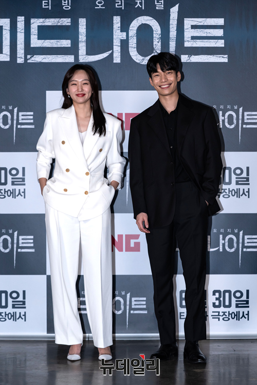 배우 진기주(왼쪽)과 배우 위하준이 9일 오후 온라인으로 진행된 영화 '미드나이트(감독 권오승)' 제작보고회에서 포토타임을 갖고 있다.