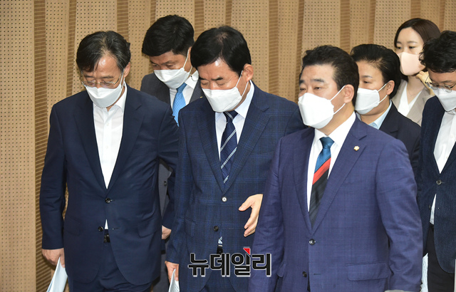 김진표 더불어민주당 부동산특위 위원장과 소속 위원들이 10일 오전 국회 소통관에서 주택시장 안정을 위한 추가 공급대책을 발표하고 회견장을 떠나고 있다.