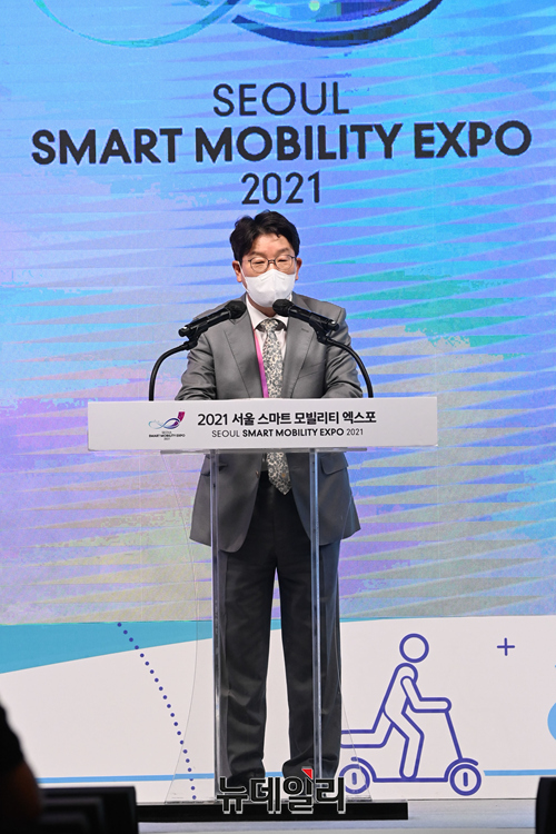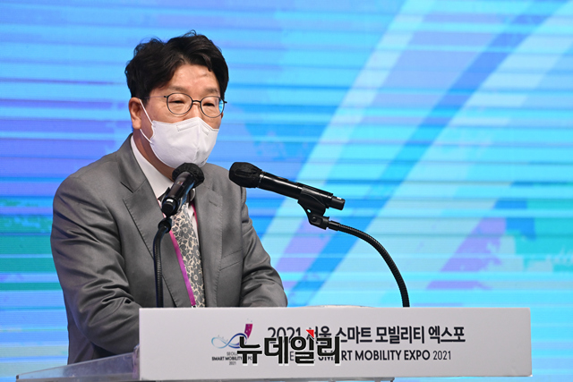 권성동 국회 모빌리티포럼 공동대표가 10일 오전 서울 마포구 문화비축기지에서 진행된 '2021 서울 스마트 모빌리티 엑스포' 개회식에서 인사말을 하고 있다.