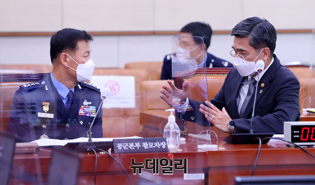 서욱 국방부 장관과 정상화 공군참모차장이 10일 오전 국회에서 열린 법제사법위원회 전체회의 공군 성추행 사건 관련 긴급현안질의에 앞서 대화를 나누고 있다. (사진=공동취재단)