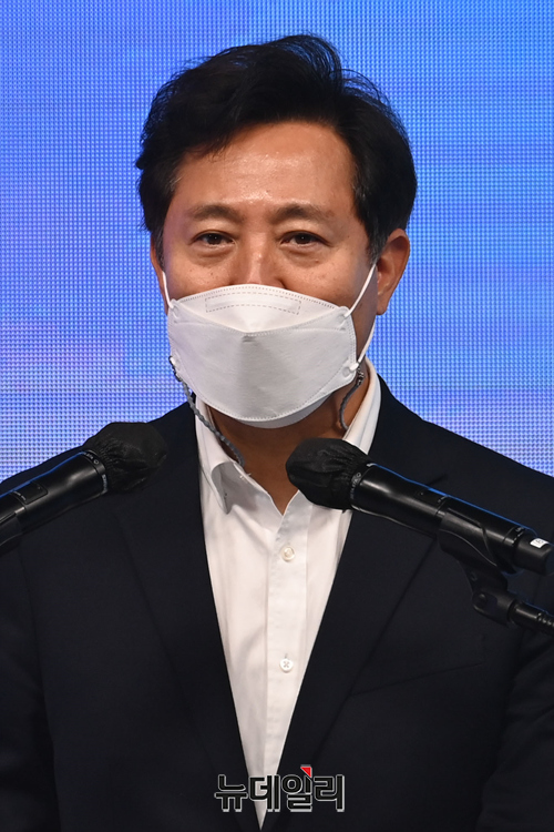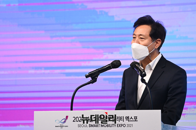 오세훈 서울시장이 10일 오전 서울 마포구 문화비축기지에서 진행된 '2021 서울 스마트 모빌리티 엑스포'에서 인사말을 하고 있다.
