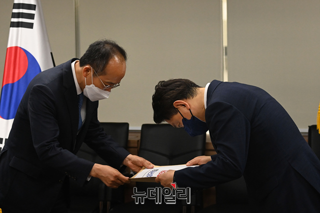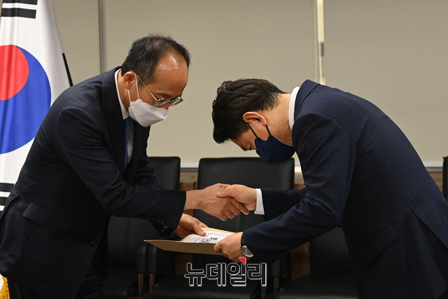 추경호 국민의힘 원내수석부대표가 11일 오전 서울 종로구 국민권익위원회 서울사무소를 방문해 '부동산 투기의혹 진상규명을 위한 국민의힘 국회의원 전수조사 의뢰서'를 김태응 국민권익위원회 부동산거래특별조사단장에게 전달하고 있다.