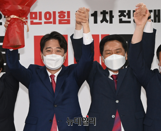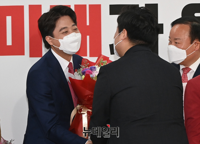 이준석 국민의힘 신임 당대표 당선자와 최고위원 당선자들이 11일 오전 서울 여의도 국민의힘 중앙당사에서 열린 전당대회에서 당선자 지명 후 인사하고 있다. (사진=공동취재단)
