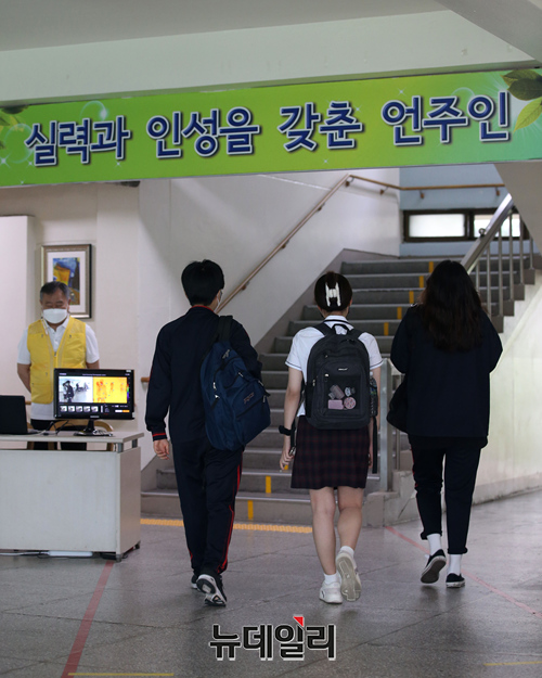 수도권 소재 중학교의 등교 수업이 확대 실시된 14일 오전 서울 강남구 언주중학교에 학생들이 등교를 하고 있다. 교육부에 따르면 14일부터 사회적 거리두기 2단계에서 수도권 중학교의 학교 밀집도 기준이 기존 '3분의 1'에서 '3분의 2'로 완화되면서 등교 확대가 가능해졌다. (사진=공동취재단)