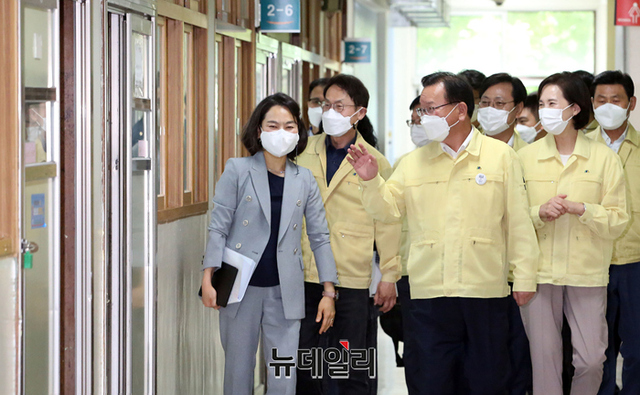 김부겸 국무총리가 학교 방역상황 점검을 위해 14일 오전 서울 목동 신목중학교를 방문해 수업을 참관하고 있다. 현장에는 유은혜 교육부 장관과 조희연 서울교육감이 참석했다.