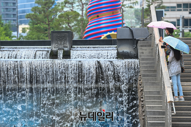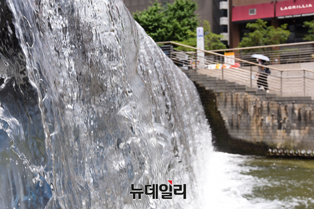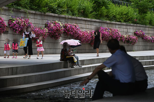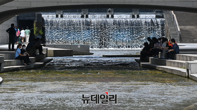전국 대부분 지역이 낮 기온 30도 이상을 기록한 14일 오전 서울 종로구 청계천에 찾은 시민들이 더위를 피하기 위해 징검다리를 건너고 있다.