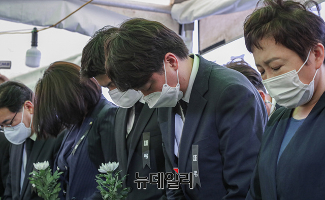 이준석 국민의힘 당대표와 최고위원들이 14일 오전 광주 동구청에 마련된 학동4구역 철거현장 붕괴사고 희생자 합동분향소를 찾아 조문하고 있다. (사진=국민의힘)
