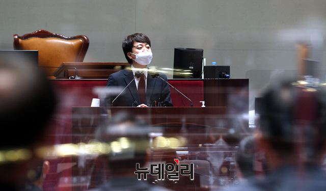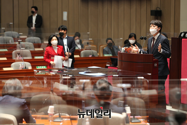 이준석 국민의힘 신임 대표가 14일 오전 국회에서 열린 의원총회에서 인사말을 하고 있다. (사진=공동취재단)