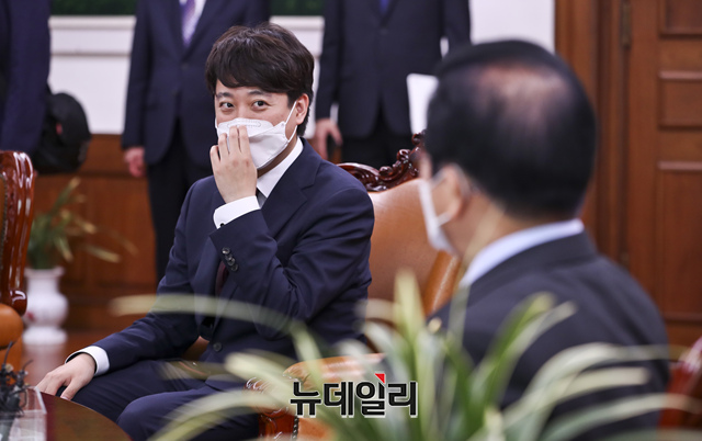 박병석 국회의장이 14일 오후 국회 의장실을 예방한 국민의힘 이준석 신임 당 대표와 대화를 나누고 있다. (사진=공동취재단)