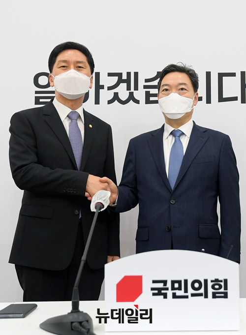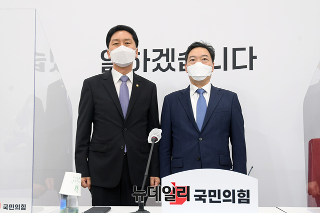 김기현 국민의힘 원내대표가 14일 오후 국회에서 김오수 검찰총장 예방을 받고 기념촬영을 하고 있다. (사진=공동취재단)