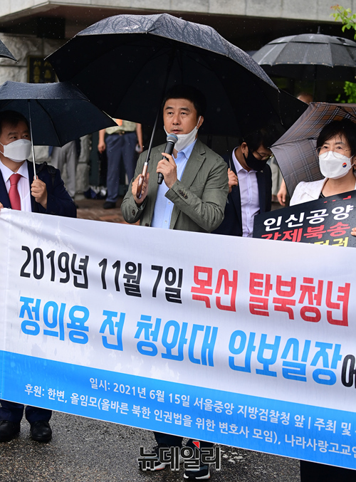 강철환 북한전략센터 대표가 15일 오전 서울 서초구 서울중앙지검 앞에서 열린 정의용 전 청와대 안보실장에 대한 고발 기자회견에서 발언하고 있다.2019년 11월 동해 북방한계선 인근 해상에서 나포한 북한 주민 2명을 판문점을 통해 북한으로 추방한 사건과 관련해 정의용 외교부 장관은 지난 4월 관훈토론회에서 북송 결정은 당시 국가안보실장으로 직접 결정했고, 대통령에게 보고 하지 않았다고 밝혔다.한반도인권과통일을위한변호사모임, 북한인권단체총연합, 나라지킴이고교연합 등은 북한 주민 2명의 강제북송이 직권남용 및 미필적 고의에 의한 살인죄, 범인도피죄, 증거인멸죄에 해당된다며 검찰에 고발했다.