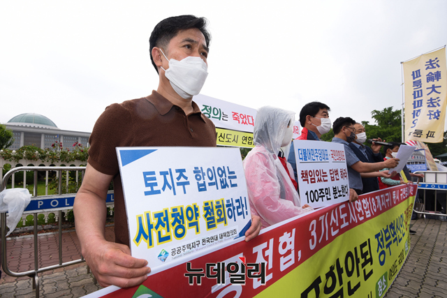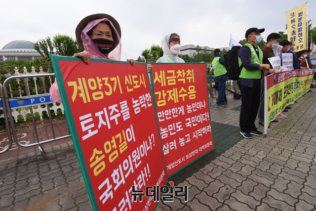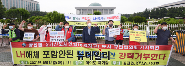 공공주택지구전국연대대책협의회(공전협), 3기 신도시연합이 15일 오전 서울 여의도 국회 앞에서 △부패한 LH공사 해체 △땅 투기에 대한 수용지구 원주민들에게 피해 보상 △조세특례제한법 개정 착수 및 양도소득세 전액 면제 등을 요구하는 기자회견을 갖고 있다.