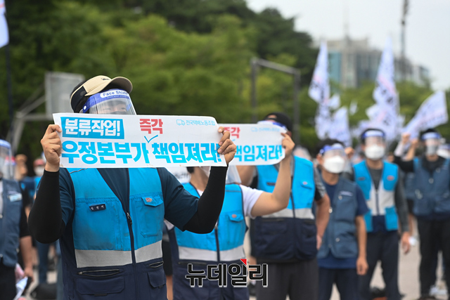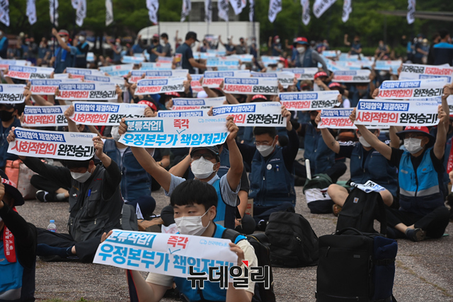 전국택배노조원들이 15일 오후 서울 여의도공원에서 열린 서울 상경집회에서 실질적인 사회적 합의 이행을 촉구하며 율동을 하고 있다.