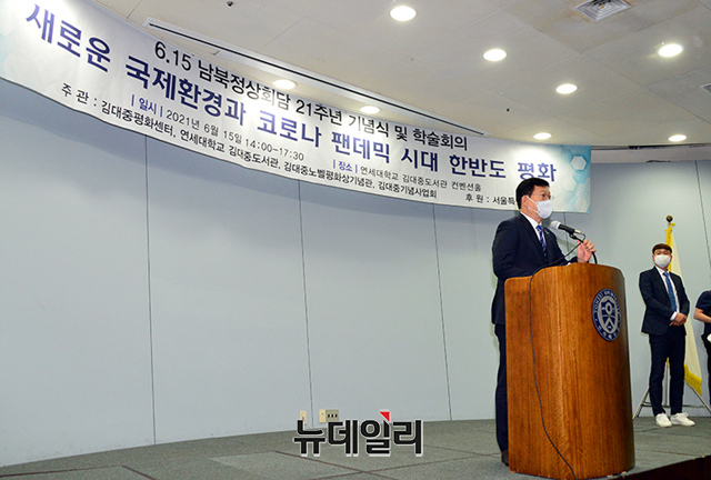 송영길 더불어민주당 대표가 15일 오후 서울 서대문구 연세대학교 김대중도서관 컨벤션홀에서 열린 '6.15남북정상회담 21주년 기념식'에서 발언을 하고 있다. (사진=더불어민주당)