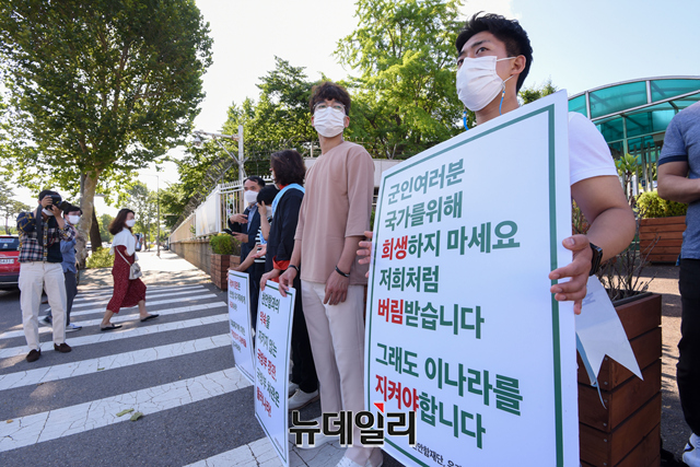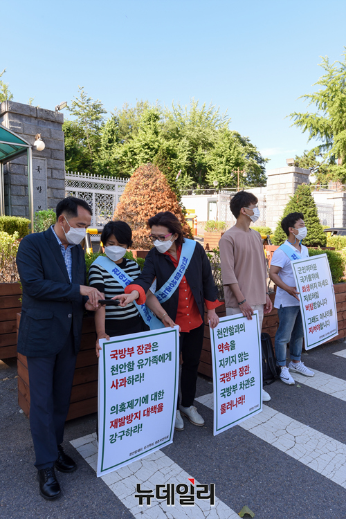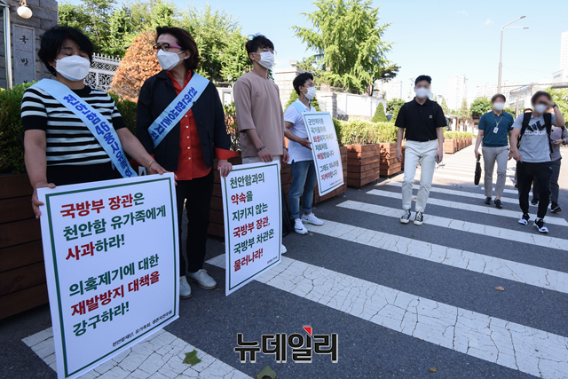 천안함46용사유족회와 천안함생존자전우회가 16일 오전 서울 용산구 국방부 앞에서 천안함 명예회복 시위를 40일째 이어가고 있다.