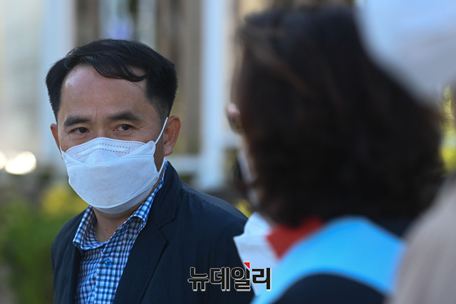 최원일 전 천안함 함장이 16일 오전 용산구 국방부 정문에서 천안함 명예회복 집회를 진행에 참석하고 있다.