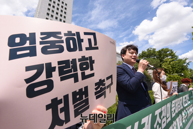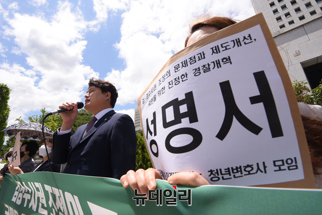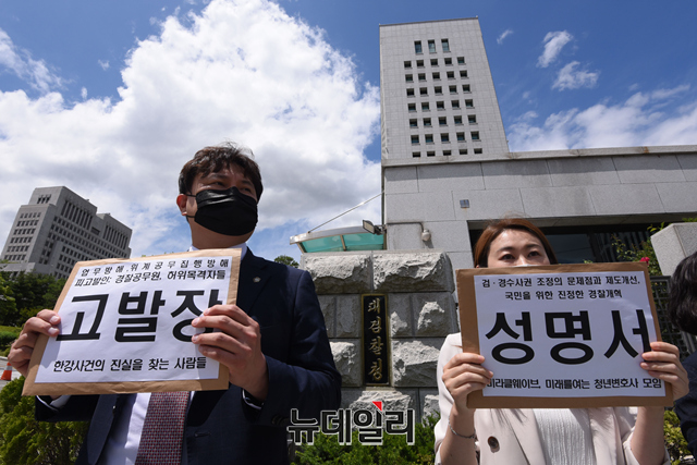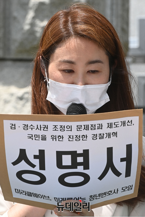 자유대한호국단, 미래를여는청년변호사모임, 미라클웨이브 등 시민단체가 16일 오전 서울 서초구 대검찰청 앞에서 '검경수사권 조정의 문제점과 제도개선'을 촉구하는 기자회견을 갖고 있다.호국단은 "현 정부에서 그토록 염원하던 '검ㆍ경수사권 조정'이 2020년 형사소송법 개정을 통해 검사와 사법경찰관의 관계가 지휘ㆍ감독관계에서 대등한 협력관계로 제도화 됐다"며 대한민국 경찰이 진짜 국민을 위해 민주적이고 효율적으로 수사를 진행했는지에 대해 질문을 던졌다.이어 지난 4월 25일 새벽 한강공원에서 발생한 손정민 군의 의문사 사건에 대해 "수사에 소극적인 모습을 보여 다수의 국민들로부터 의혹을 증폭 시키고 있다"며 경찰에게 진실관계를 밝혀줄 것을 요청했다.
