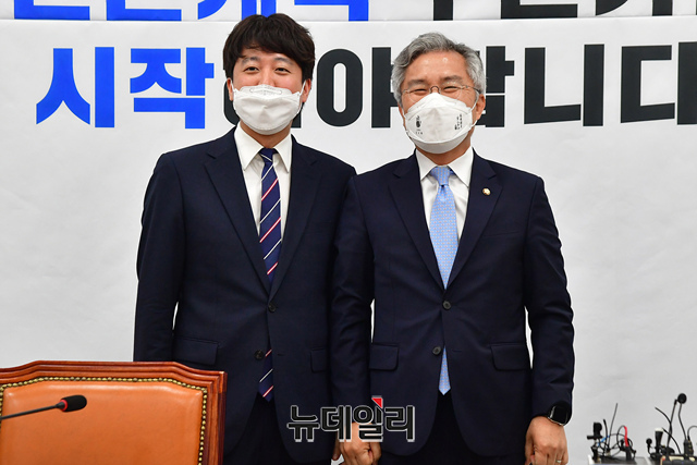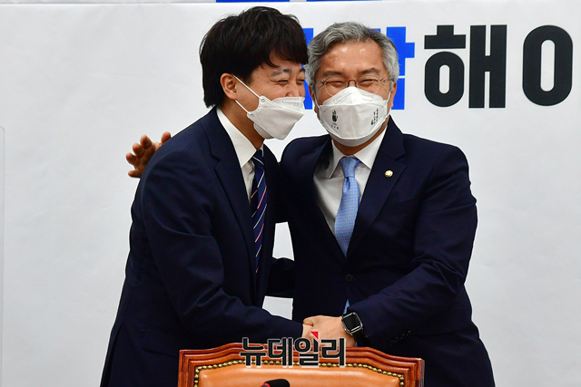 [포토] 최강욱 열린민주당 대표 찾은 이준석 국민의힘 대표