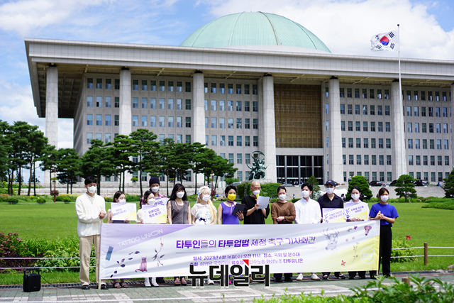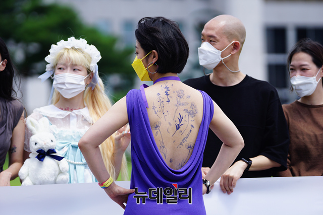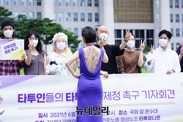 류호정 정의당 의원이 16일 오후 국회에서 타투인들과 함께 타투입법 제정 촉구 기자회견을 갖고 있다.