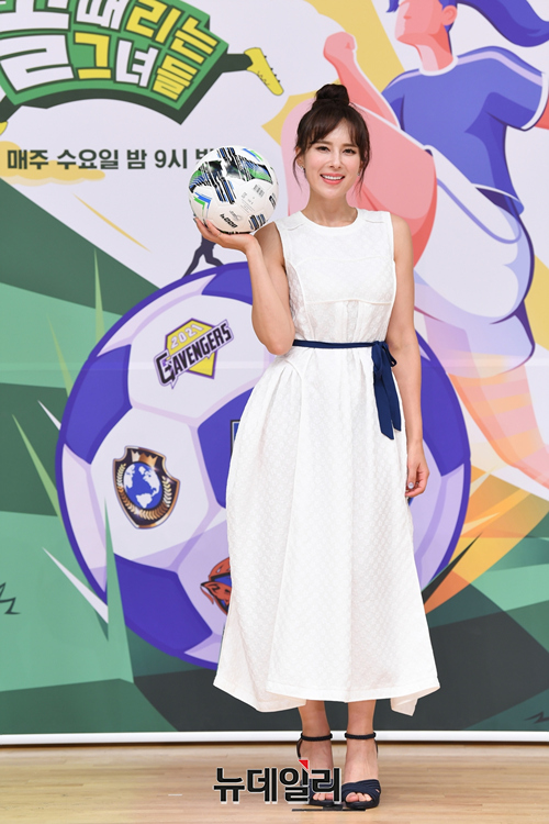 방송인 에바가 16일 오후 온라인으로 진행된 SBS 예능 '골 때리는 그녀들' 제작발표회에서 포토타임을 갖고 있다.