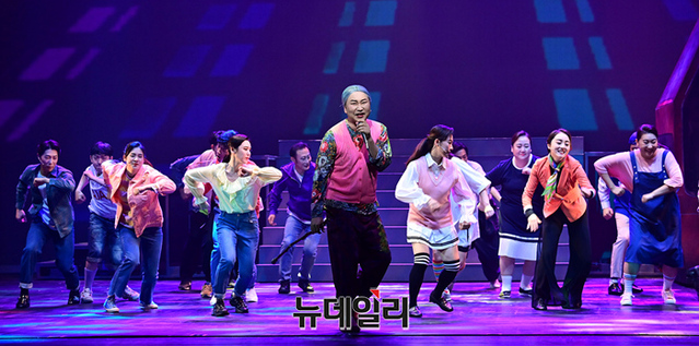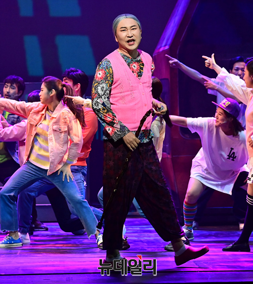 개그맨 최국이 공연을 하루 앞둔 16일 오후 서울 강남구 LG아트센터에서 뮤지컬 '박정희' 최종 리허설 무대를 선보이고 있다. 최국은 뮤지컬에서 다양한 역을 맡아 열연한다.