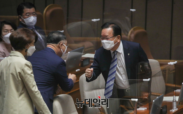 김부겸 국무총리, 홍남기 부총리 겸 기획재정부 장관이 17일 오전 국회에서 열린 본회의에서 인사를 나누고 있다. (사진=공동취재단)