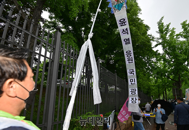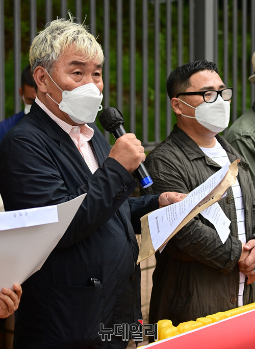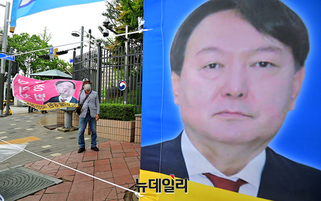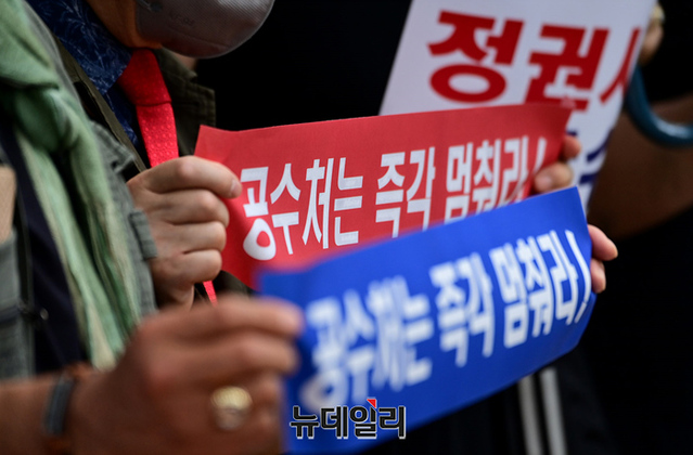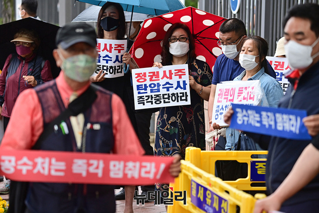 윤석열 팬클럽 '국민광장' 회원들과 시민단체 대한민국애국순찰팀이 18일 정오 경기 정부과천청사 앞에서 공수처의 선거개입 중단을 촉구하는 기자회견을 갖고 있다.